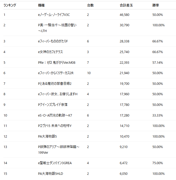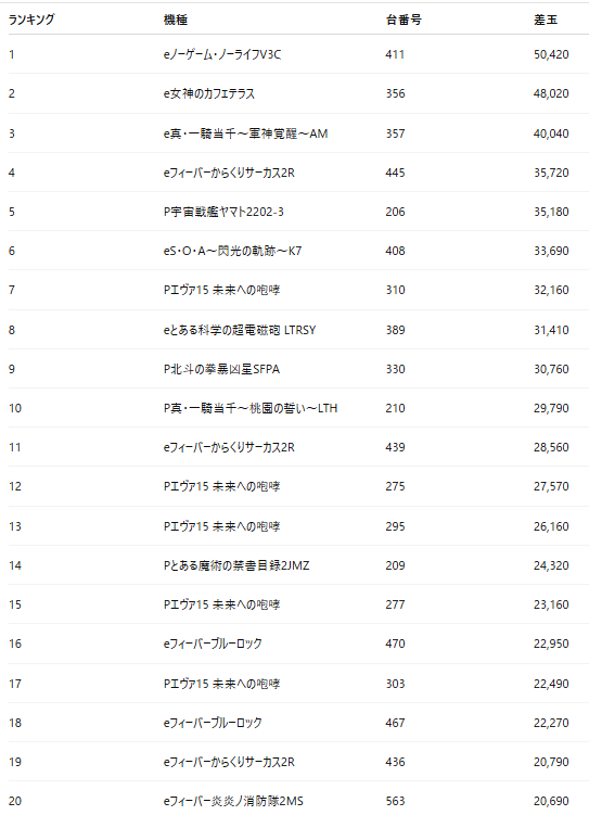 ・1位は新台「eノーゲーム・ノーライフV3C」。5万発超の大幅プラス差玉でトップとなった。
