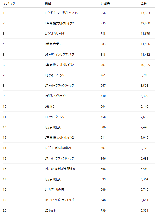 ・20位まで広げてもすべての台が5,500枚超となり、一日を通して高出力で推移したことが分かる。