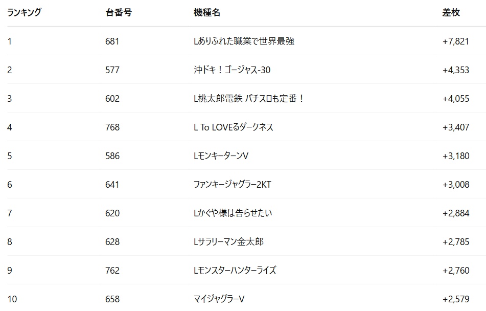 今回も多彩な機種から高差枚が記録されており、特定機種に偏らない営業スタイルが継続していることがうかがえます。