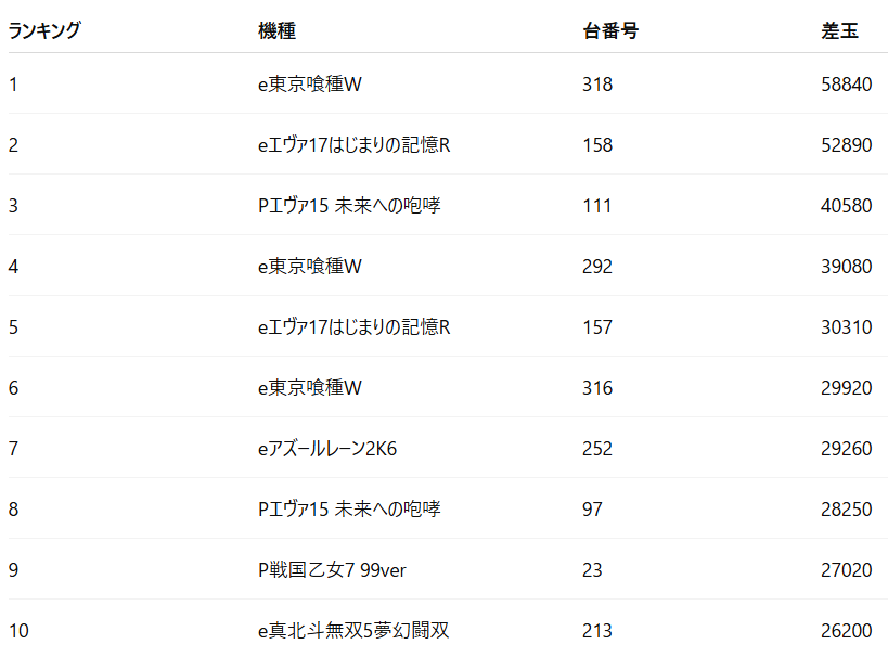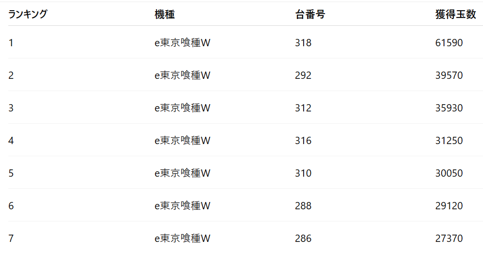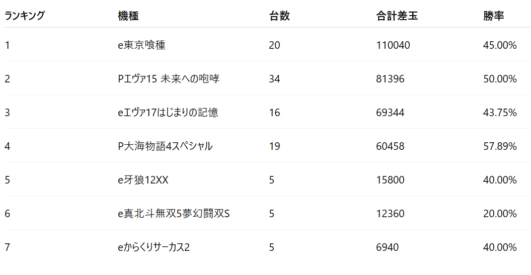 ・「e東京喰種」が合計110,000発超えと圧倒的なユーザープラス差玉で首位を獲得し、機種単位で突出した結果を記録した。