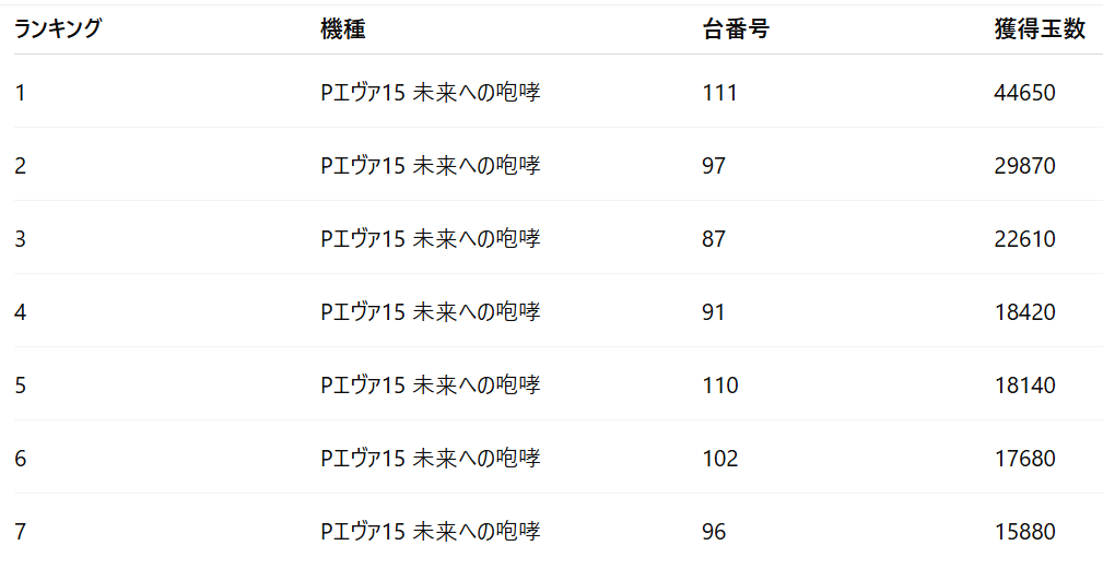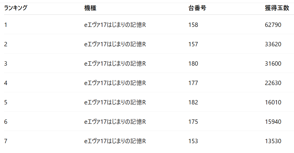 ・「eエヴァ17」「Pエヴァ15」といったエヴァシリーズも複数ランクインし、シリーズ機としての安定した支持と出玉力が確認された。