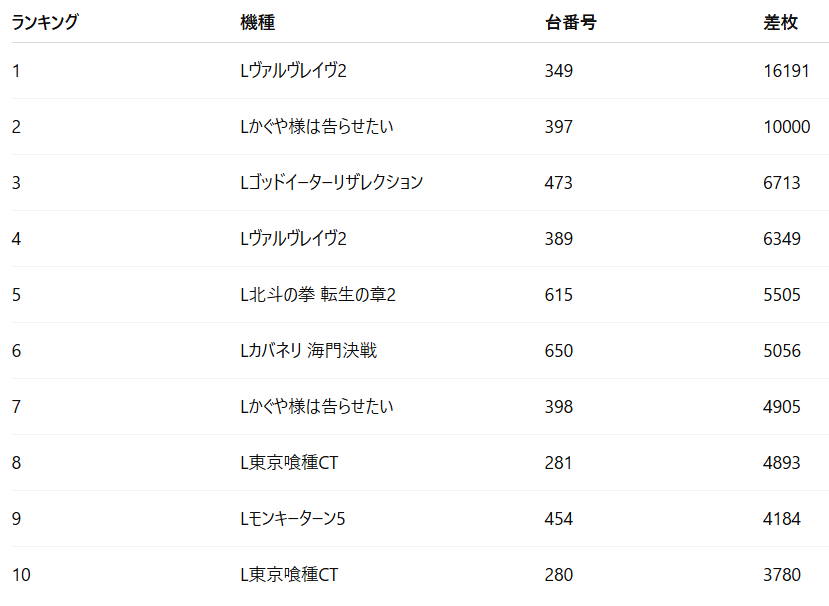 ・「Lヴァルヴレイヴ2」が差枚16,000枚超えで首位を獲得し、出玉性能の高さが際立つ結果となった。
