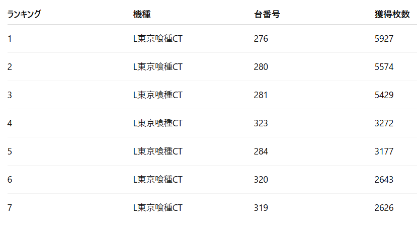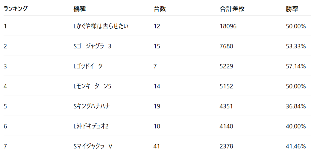 ・「Lかぐや様」「L東京喰種」など三共系機種が多数ランクインし、同メーカー系統の強さが目立つ構成となった。